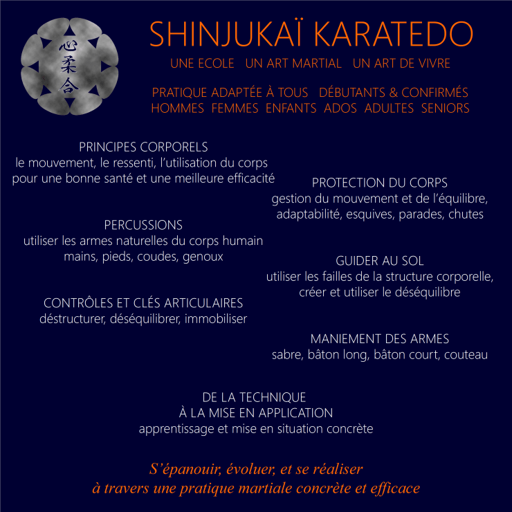 Les cours que nous proposons sont basés sur les piliers de notre pratique que sont le Karate Shotokan et l’Aïkido Kishinkaï, mais également le travail aux armes, la défense personnelle, le jujutsu, la boxe pieds poings et l’éveil corporel. Car c’est ça le Shinjukaï.